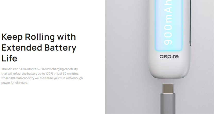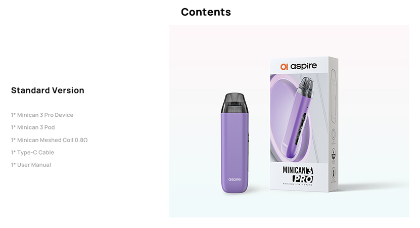 小機身 × 高續航 × 功能完整,Minican 3 Pro 是 Aspire 經典入門系列的進階版本,內建 900mAh 電池,支援 5–20W 可調輸出與 0.69 吋 OLED 螢幕顯示,搭配 Minican 系列艙體系統,是想兼顧輕巧與調整功能的鹽油使用者新選擇。