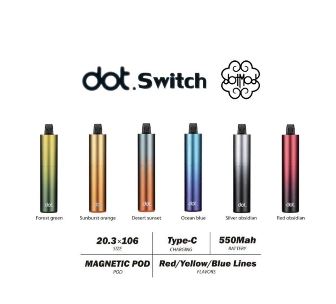 DOTMOD Dot Switch 小煙主機,內建 550mAh 電池與 3.5mL 大容量艙,採用磁吸連接與防漏設計,輕巧便攜且穩定輸出,提供順暢的 MTL 鹽油口感體驗,台灣現貨供應!