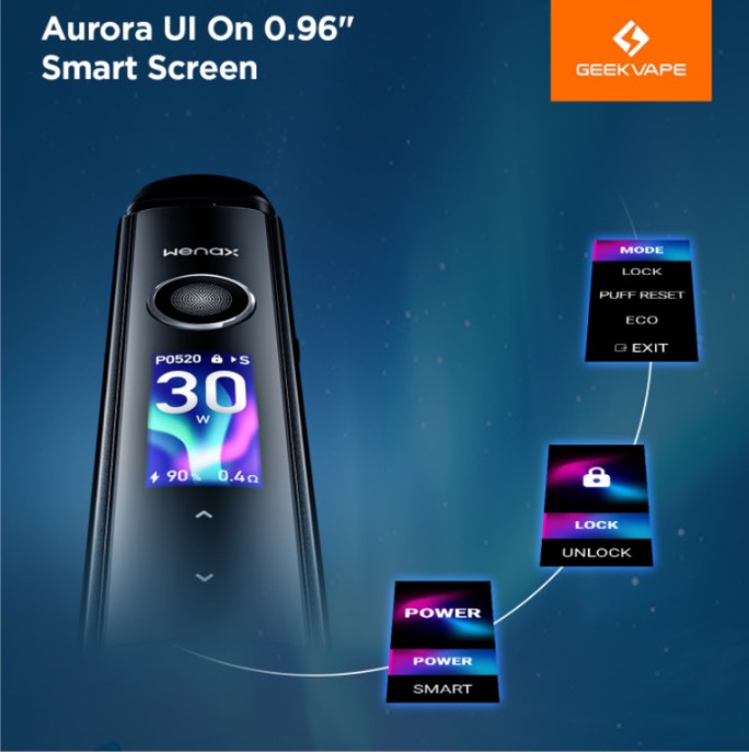GeekVape Wenax Q Pro,1200 mAh 電池、最高 30 W 可調輸出、0.96″ 彩色智慧螢幕、觸感回饋按鍵、三段氣流調節、快充、IP防摔設計,兼具美型與易用性的高級 Pod 機。