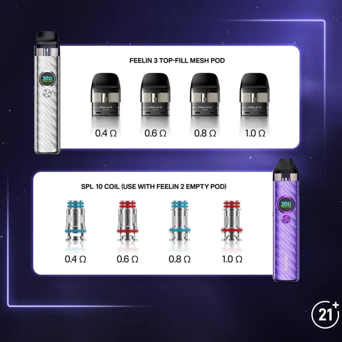 NEVOKS FEELIN 3 結合輕巧機身與穩定輸出,搭載 1000mAh 大容量電池與 USB-C 快充,支援 SPL-10 網狀霧化芯與頂部注油艙體,專為鹽油與尼古丁鹽打造。