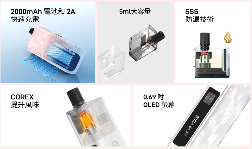 代表機型如 LUXE、TARGET、XROS 系列,結合獨家 AXON 晶片技術,提供穩定輸出、智能功率控制與極快點火反應。Vaporesso 同時在霧化結構設計上不斷創新,推出 SSS 防漏結構與 COREX 高還原加熱核心,全面優化口感表現與使用體驗。
