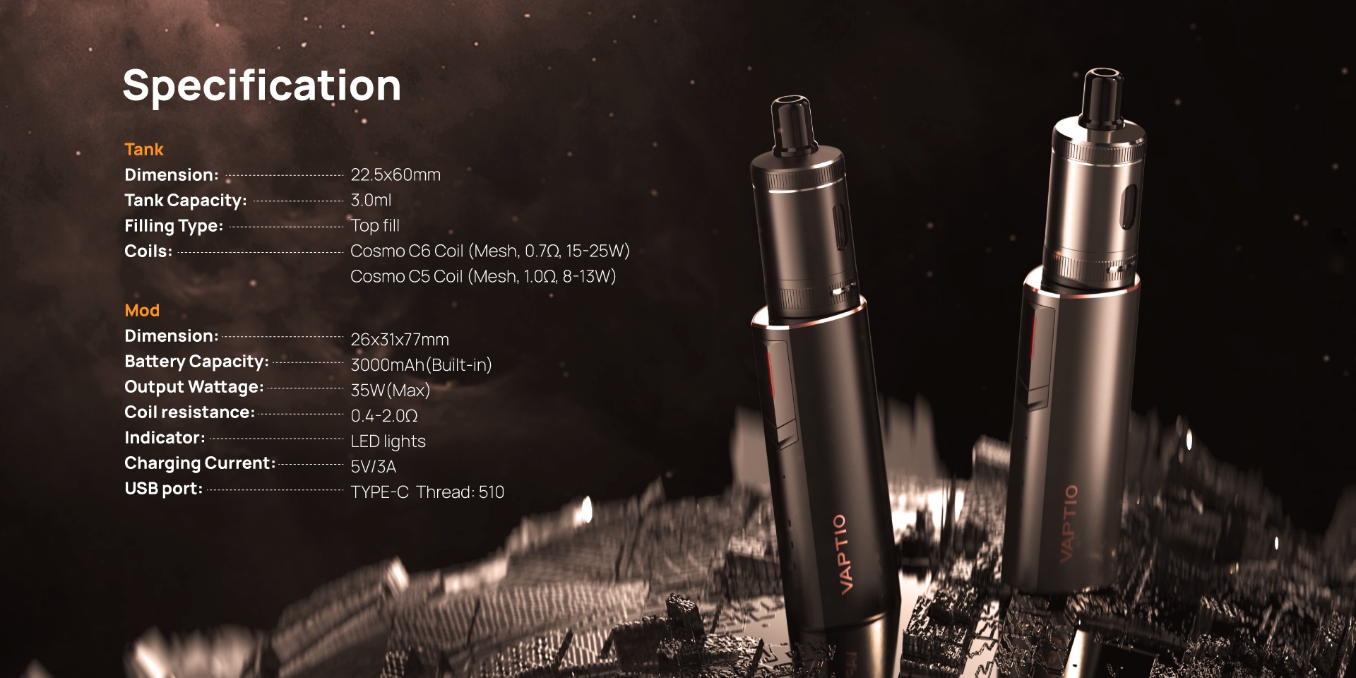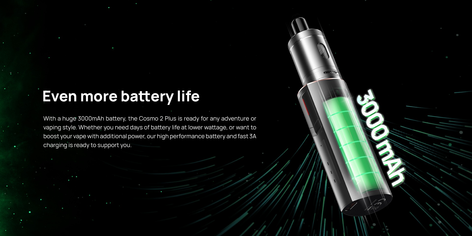 Cosmo 2 Plus 套件配備3000mAh 可充電電池,可確保長時間吸煙,且動力可調整至35W。
