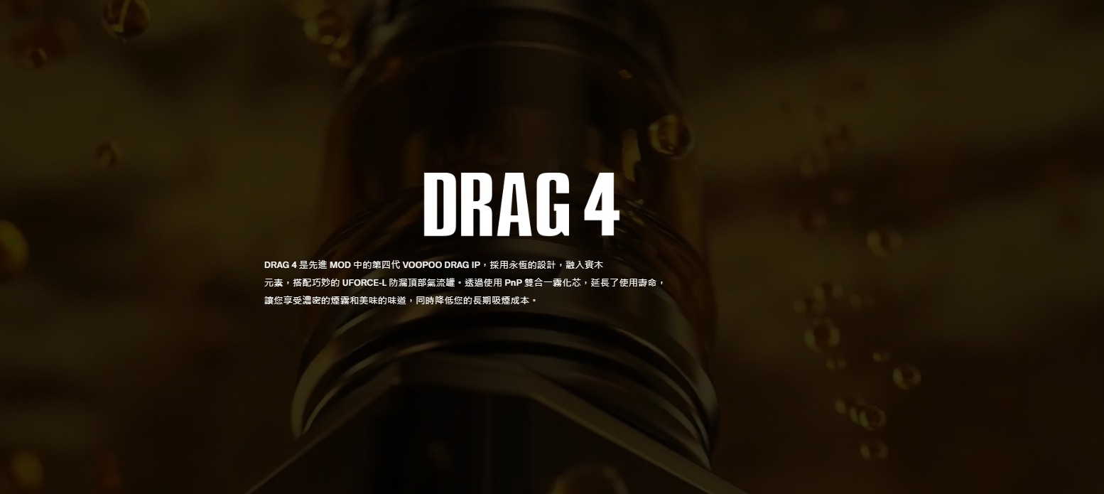 VOOPOO DRAG 4 主機搭載 GENE.TT 2.0 晶片,支援雙 18650 電池與最高 177W 輸出,搭配全新 PnP X 雾化艙系統與經典金屬+木紋外型,是重口味雲量玩家與 RBA 進階用戶的頂規推薦!台灣現貨供應!